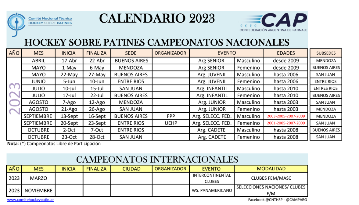 Este es el calendario de hockey sobre patines para 2023 El Comité Nacional de Hockey sobre Patines confirmó las fechas del cronograma. Prensa Capatin14 de marzo de 2023 Facebook0 Twitter LinkedIn0 Tumblr 0 Likes